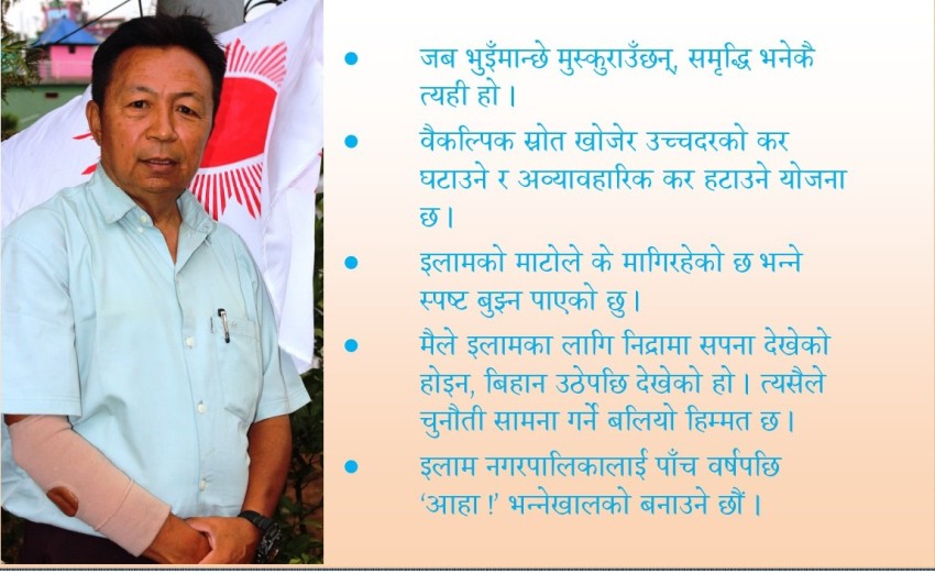 पहिलो कुरा चाहिँ म एउटा भुइँमान्छे हुँ । म यहींको माटोसँग खेलें । माटोसँगै हुर्किएँ । यहाँका जरा, बुट्टा, खोलानालासँग परिचित भएँ । सबैखाले जातजाति, धर्म, संस्कृति, परम्परा, सम्प्रदायलगायत सबैखाले मान्छेसँग घुलमिल हुन पाएँ । सबैसँगको सम्बन्ध प्रगाढ बन्यो । सबैले अहिलेसम्म गर्नुभएको माया मेरो उम्मेदवारीको आधार हो । र, इलामको माटोले के मागिरहेको छ भन्ने पनि मैले स्पष्ट बुझ्न पाएको छु । इलाम नगरका सबै ठाउँ पुगेको छु । सबैजसो धेरैजसो घरलाई सेल्टरका रूपमा प्रयोग पनि गरेको छु ।