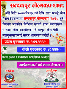इलामको सन्दकपुर गाउँपालिकास्थित देउरालीको सात खाल्डे खेल मैदानमा पुरुषस्तरीय फुटबल प्रतियोगिता हुने भएको छ । बर्षेनी हुने प्रतियोगितामा आउँदो चैत २५ बाट सुरु हुने छ । प्रतियोगितामा १४ टिमको सहभागिता रहने छ । देउराली स्पोटिङ क्लवको आयोजनामा हुने प्रतियोगितामा इलाभेन वारियर कमल गाउपालिका सैनिक फुटबल क्लव, देउमाई फुटबल क्लव, जनता सेभेन, माइनगरपालिका स्पोटिङ क्लव, माइजोगमाई गाउँपालिका स्पोटिङ क्लव, गोदक फुटबल क्लव, हेल्लो जस्विरे, नवज्योती फुटबल क्लव, योङबोइज फुटबल क्लव, फालेलुङ फुटबल क्लव, इलाम फुटबल क्लव , सन्दकपुर फुटवल क्लव र देउराली स्पोर्टिङ क्लब रहेका छन् ।