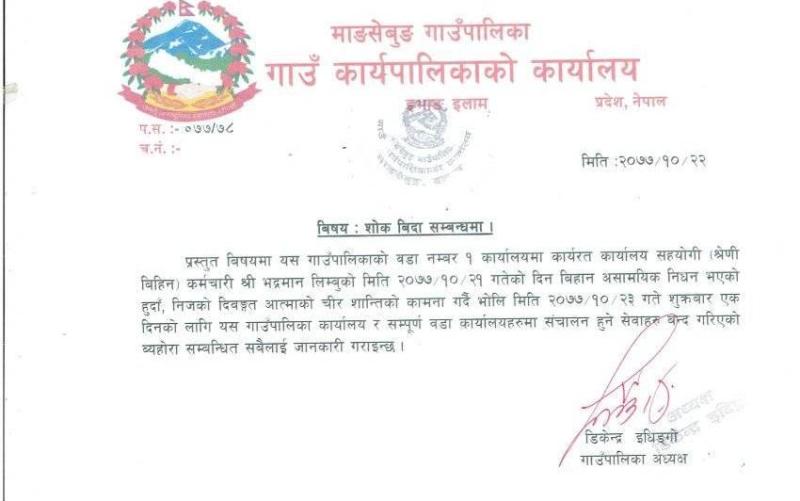 विहीबार माङसेबुङ गाउँपालिका अध्यक्ष डिकेन्द्र इधिङ्गोले विज्ञप्ती जारी गर्दै कार्यालय सहयोगी लिम्बूको निधनका कारण शुक्रबार पालिकाको सेवा सुविधा बन्द गरिएको जनाएका छन् ।